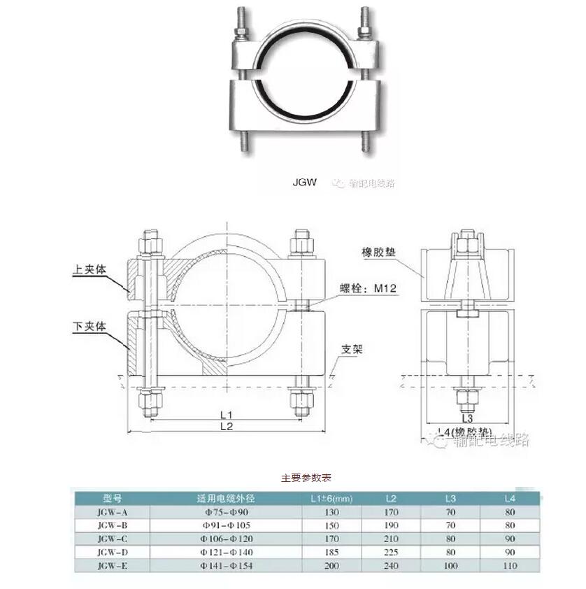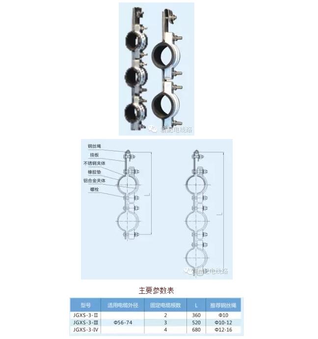 夹具体采用高强度抗磁防腐铝合金为材料,内衬有橡胶垫,夹具体一半采用高强度钢材,一半采用高强度抗磁防腐铝合金为材料,既保证了夹具体强度,又阻隔磁路,适用于三芯、单芯电缆。固定夹具总额定承重为200千克,根据电缆重量约1.8米左右安装一个。