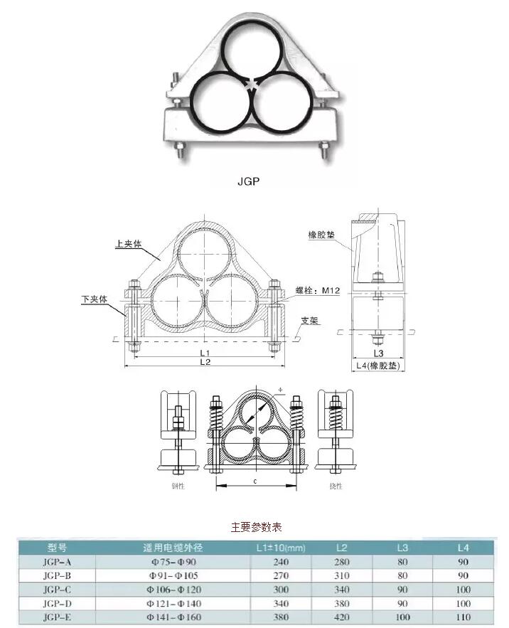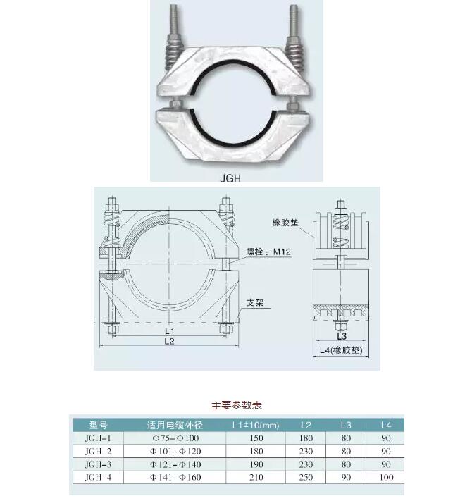 本夹具主要用于单芯电缆的固定。夹具主要采用高强度抗磁防腐铝合金为材料,内衬有橡胶垫,夹紧结构采用螺栓加弹簧扰性固定。固定夹具由螺栓固定在电缆支架或桥架上。