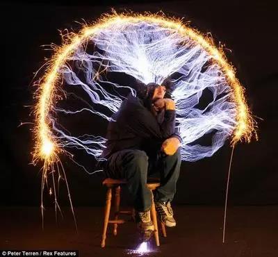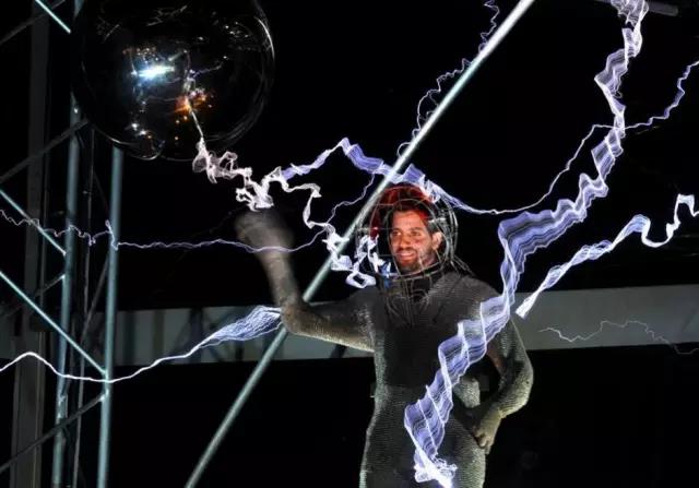科学疯子无极限!2012年10月8日,美国著名魔术师大卫-布莱恩在纽约54码头的魔术表演中成功挑战人类极限。他连续三天三夜置身于100万伏高压人工雷电环境中。注意!他也身着特制的金属外套和头盔……这些科学疯子所作所为,利用的都是著名的特斯拉线圈原理。