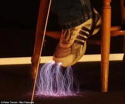 从特斯拉线圈电极释放的电流将以半圆的形式通过他的身体,然后电流传导至箔绝缘服,最终通过脚底安全地释放到地面上。